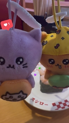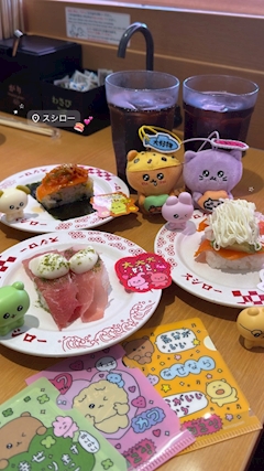 まおです🎶 今日も出勤しました〜🌟 今日は朝から開店でスシロー行って コラボ行ってきました✨ とっても可愛かった😭💕 値段はかわいくないけど!! 大食いだからたくさん食べた🎶 美味しかったー‼️